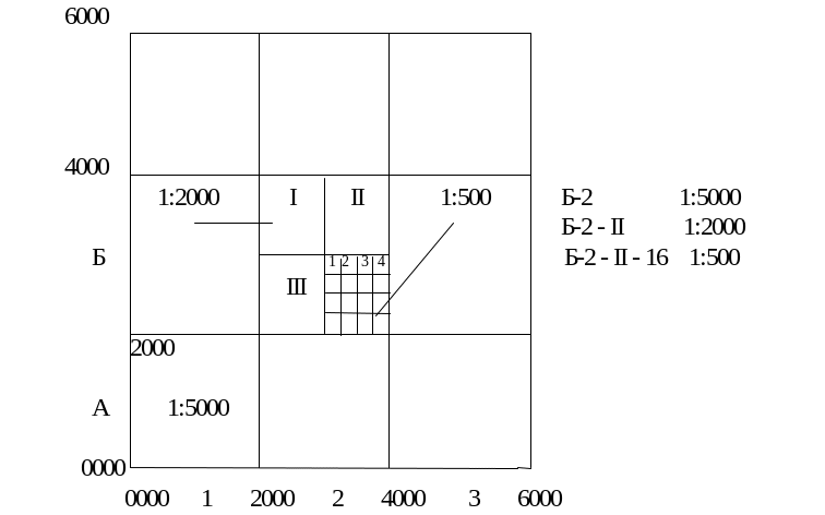 Для получения плана М 1:1000, план М 1:2000 делится на 4-ре части, которые обозначаются римскими цифрами - I, II, III, IV.