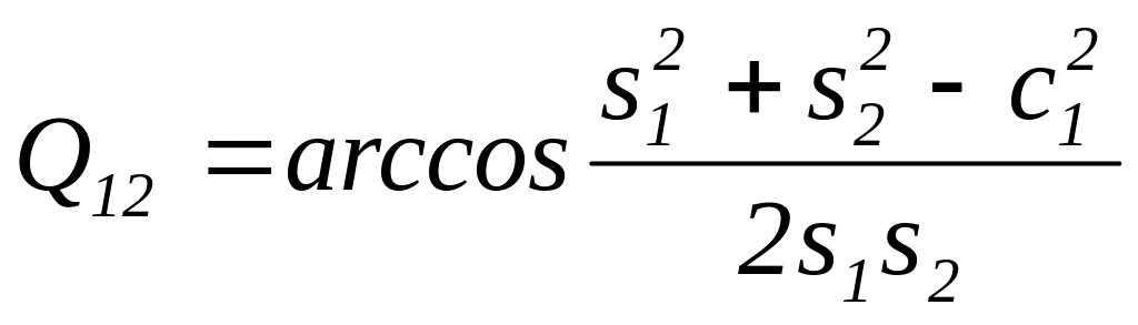 В практике монтажных работ довольно распространенной операцией является контроль перпендикулярности закрепленных на фундаменте (опорной плите) осей оборудования. Если в точке пересечения этих осей можно установить теодолит, то такая задача решается измерением прямых углов и анализом результатов. Если же указанная точка недоступна для установки прибора, то целесообразно применять либо способ продолженных створов, измерив угол между ними, либо способ трилатерации, например, если выверяемая деталь расположена в наклонной плоскости. При этом рулеткой измеряют хорды c1, c2, с3, с4 и расстояния s1 между точками осей (i= 1, . . . , 4) в цельной конструкции (рис. 49, а) или диагонали di (i = 1, 2) в пустотелой (рис. 49, б). Теперь, по измеренным сторонам, можно вычислить необходимые углы: в первой схеме