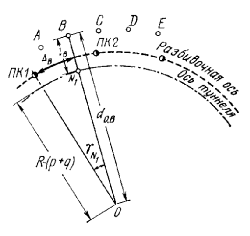 От полигонометрического знака В откладывают разность lB - lA и получают точку М. Линия АМ параллельно оси тоннеля. Откладывая от этой линии величину lА в натуре, можно получить точки трассы N1...Nn сколь угодно часто.