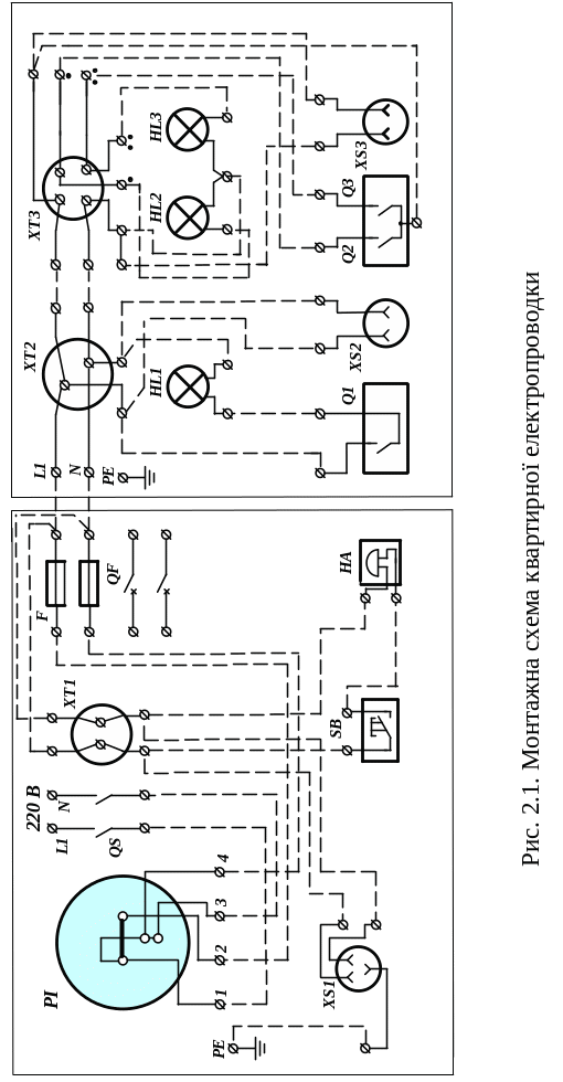 - розеток XS1 з трьома контактами, XS2 та XS3 з двома контактами для тимчасового приєднання квартирних електроспоживачів (холодильника, пральної машини, електропраски, телевізора, настільних ламп та інших приймачів).