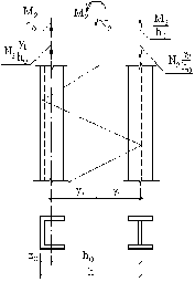Наскрізна колона працює як ферма з паралельними поясами (це її розрахункова схема). Від N i M у вітках колони виникають тільки поздовжні зусилля, тобто кожна окрема вітка працює як центрально стиснутий елемент. Поперечну силу Q повністю сприймає з’єднувальна решітка.