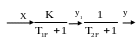 Сначала выходная величина объекта изменяется со все более увеличивающейся скоростью, а затем, вследствие уменьшения перепада давления на соединительном вентиле, скорость изменения уровня у постепенно уменьшается до нуля. Такой объект может представлен двумя последовательно соединенными звеньями первого порядка (рис. б)