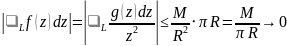 где L -- верхняя полуокружность радиуса R, проходимая против часовой стрелки. Так как f(z)=g(z)/z^2 , где g(z) -- ограничена на бесконечности, например, числом M, то