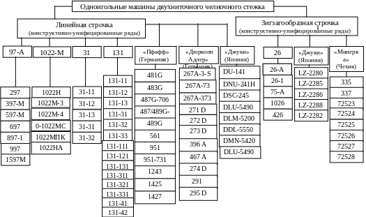 Основная доля номенклатуры швейного оборудования в настоящее время представлена в виде конструктивно-унифицированных рядов. В такие ряды входят базовая машина и ее модификации (варианты). Модификации машин, входящих в конструктивно-унифицированные ряды, характеризуются наличием унифицированных деталей и узлов машин с базовой машиной и между собой (рис. 7.1, 7.2).