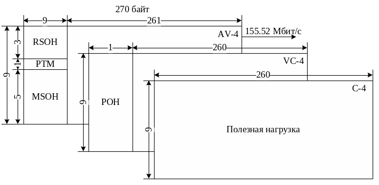Максимальная скорость передачи составляет 155.52 Мбит/с. Время передачи этого блока 125 мкс. Т.е. каждый поток идёт с частотой 8 кГц (это стандартная минимальная частота квантования).