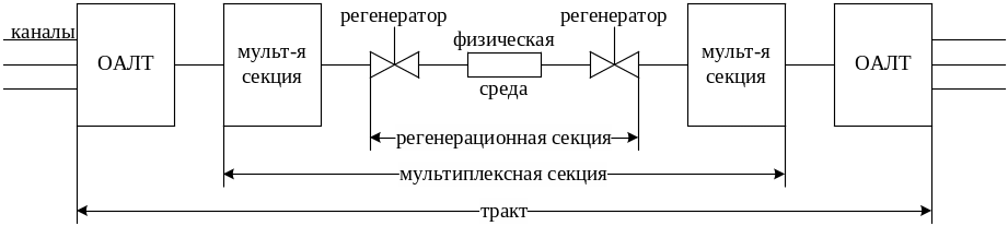 Синхронное оборудование трассы представляется в виде мультиплексоров ввода/вывода и аппаратурой оперативного переключения.