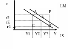 Точка В – ней денежный рынок будет находиться в состоянии равновесия, а товарный — нет. Так как точка В лежит выше кривой IS, то здесь реальный доход (выпуск) Y2 больше совокупных расходов при ставке процента r2. Фирмы не смогут продать свою продукцию, что приведет к росту товарных запасов.