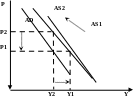 Реальный объем производства снижается с Y1 до Y2, а уровень цен растет с Р1 до Р2. Одновременно наблюдается и снижение объема производства, рост безработицы и рост цен. Сдвиг влево кривой совокупного предложения под воздействием шоков приводит к сдвигу кривой Филлипса вверх. Такой взгляд предполагает наклонную форму кривой Филлипса и объясняет стагфляцию сдвигами этой кривой.
