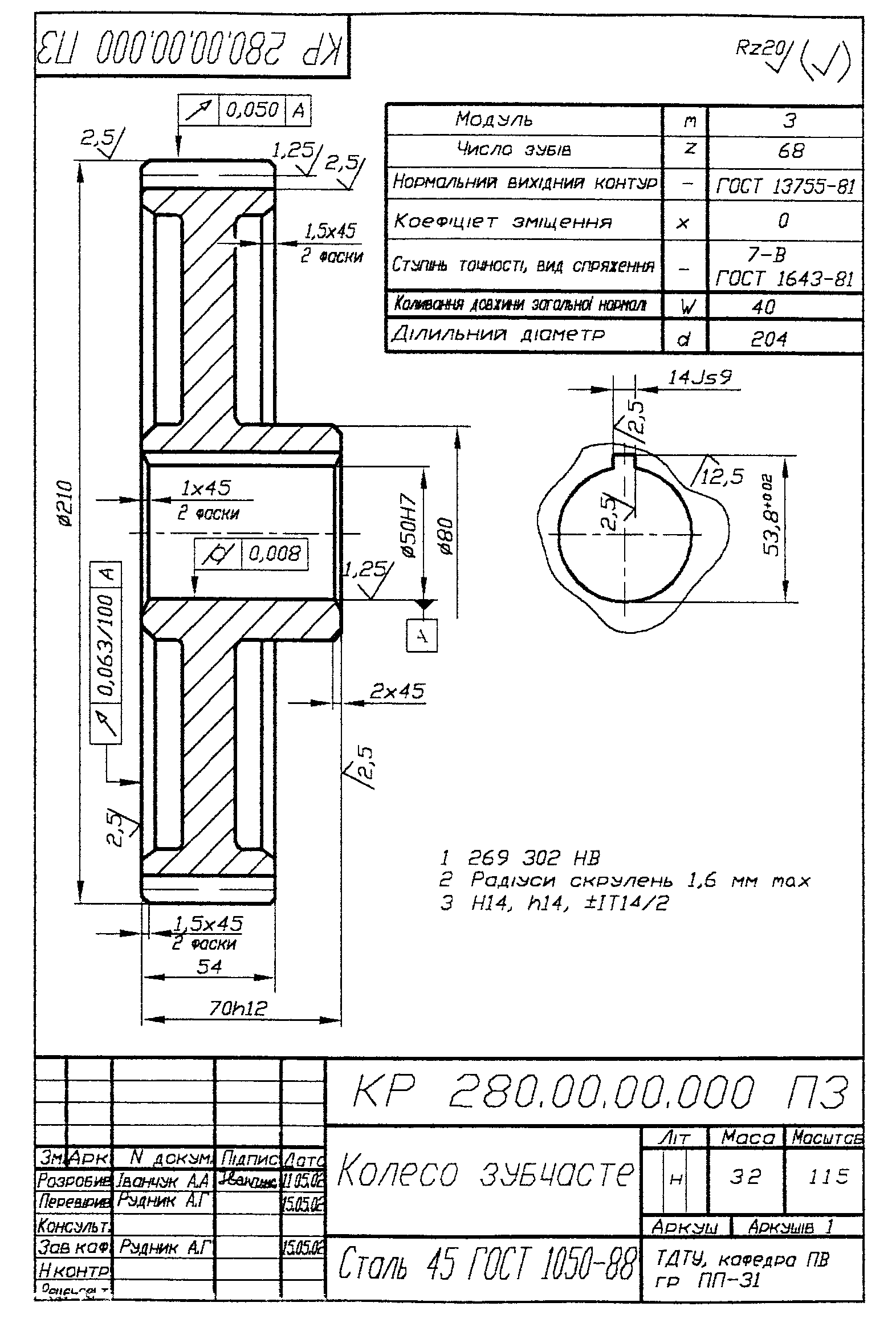 Зобразити схеми контролю контрольованих параметрів і виконати креслення зубчастого колеса.
