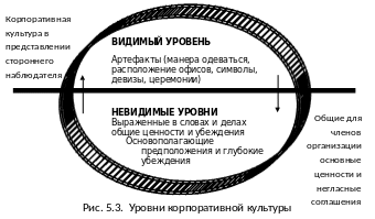 Обычно выделяют три уровня корпоративной культуры (рис. 5.3), при этом каждый последующий становится все менее очевидным.