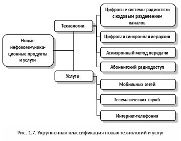 Современная классификация продуктов и услуг инфокоммуникационного характера представлена на рис. 1.7. Инфокоммуникационные продукты подразделяются на две условные группы: технологии и услуги. Технологии включают как новые, так и традиционные способы связи: