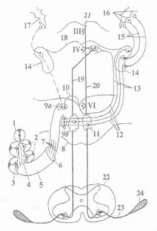 3 – спиральный, кортиев узел, 7 – улитковая часть VIII нерва (вестибулокохлеарис), 9а – дорзальное и 9б – вентральное улитковые ядра моста, 11 – дорзальные ядра трапециевидного тела нижних холмиков четверохолмия среднего мозга, 13 – латеральная петля, 14 – медиальное коленчатое тело промежуточного мозга, 15 – внутренняя капсула, 16 – корковый конец слухового анализатора, 19 – покрышечно-спинномозговой путь.