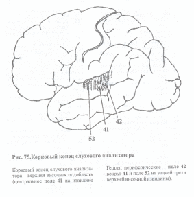 Центральный, или корковый, отдел слухового анализатора расположен в верхнего отдела височной доли обоих полушарий головного мозга (в проекционных полях 41, 42 и 52).