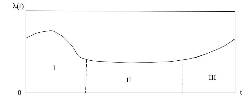 Интенсивность отказов представляет собой функцию, имеющую три характерных участка: приработки, нормальной эксплуатации, старения и износа (рис. 1.5). Для участка нормальной эксплуатации