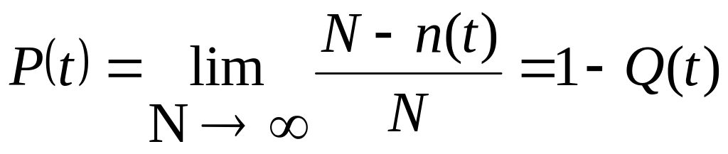 На практике пользуются статистической вероятностью, которая представляет собой предел отношения числа объектов, работающих безотказно за время t, к общему числу объектов, работающих при t = 0. Вероятность безотказной работы является событием, противоположным вероятности отказов: