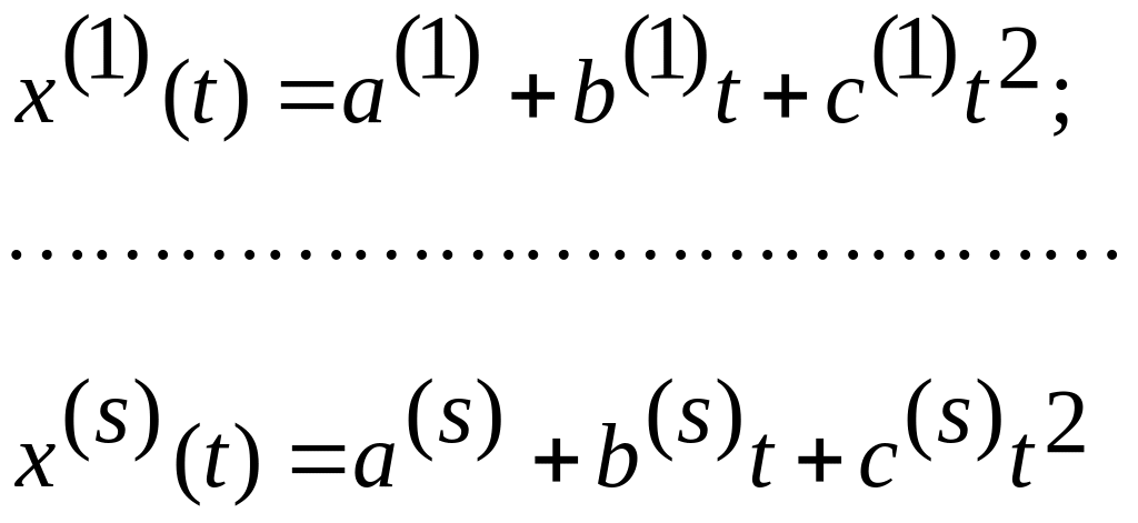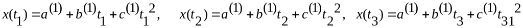 В нашем случае имеется избыточность значений x(ti), так как k > 3, а для определения коэффициентов нужно всего три значения x(ti). Чтобы решить, какие значения x(t) следует взять из таблицы, рекомендуется поступить следующим образом. Сначала из таблицы берут три первых значения, затем — три вторых и т.д. Составляют системы уравнений для каждой тройки значений x(ti), например для первой