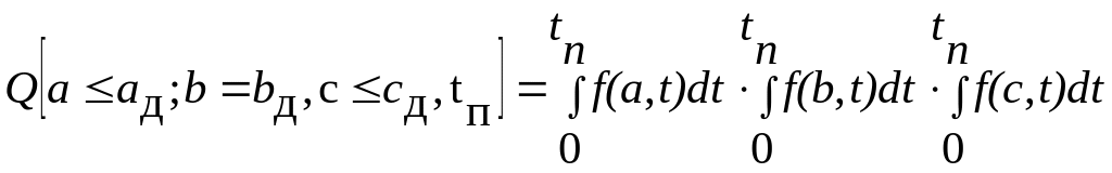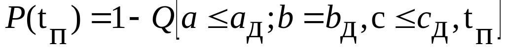 Каждый параметр, как правило, имеет присущий только ему закон плотности распределения параметра и его изменений во времени. Допустим, что объект характеризуется тремя параметрами а (t), b(t), c(t), которым определены допустимые значения ад, bд, сд (рис. 2.5). Найдем для некоторого момента времени tп вероятность безотказной работы объекта через вероятность отказа. Учитывая совместимость и предполагая независимость параметров, найдем