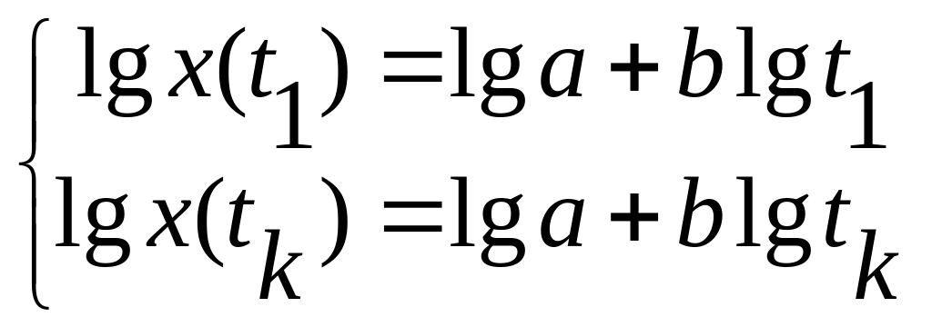 Чтобы определить неизвестные а и b, воспользуемся крайними значениями x(t1) и x(tk) из табл. 2.3. Составим систему уравнений