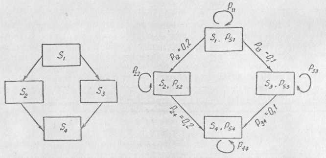 Рассмотрим процесс с дискретным временем. Система может находиться в одном из состояний Si, S2, ..., Sn. Переход в эти состояния осуществляется в дискретные моменты времени t1, t2, …, tn. Эти моменты времени составляют шаги 1, 2, ..., n. Следовательно, последовательность состояний является функцией шагов, т. е. S1(l), S2(2), ..., Sn(n). Заметим, что система при некотором i-м шаге может не переходить в другое состояние, а оставаться в прежнем. Каждое состояние оценивается вероятностью, например, Pi(k). Это означает, что вероятность i-го состояния наступает при k-м шаге. Переход из состояния в состояние происходит с некоторой вероятностью Pij. Это означает, что из состояния i в состояние j система переходит с вероятностью Pij.