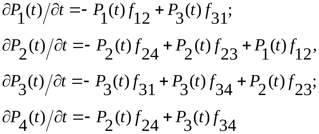 Полученную систему называют системой уравнений Колмогорова. Решая ее при нулевых начальных условиях, т. е. при t = 0, P1(0) = 1, P2(0) = … = P4(0) = 0, определяют вероятности состояний системы.