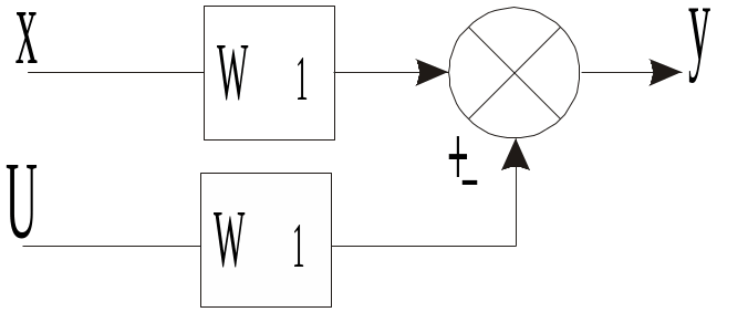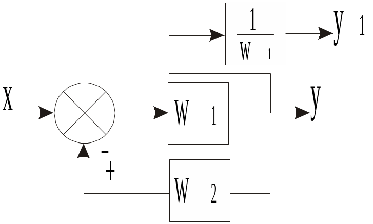 Для положительной ОС в знаменателе – знак минус. Если сменить точку снятия выходного сигнала, то меняется вид прямой цепи. Так, если считать выходным сигнал y1 на выходе звена W1, то