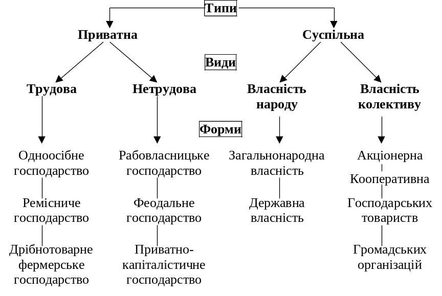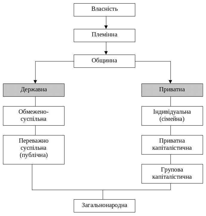 Як відомо, людське суспільство зрештою організовується у різні форми державного устрою, щоб регулювати суспільні відносини, у тому числі й економічні. Воно відбувається законодавчими актами. Власність як економічні відносини теж регулюється юридичними актами, перш за все економічним правом. На відміну від власності як економічної категорії, яка відбиває відносини "людина–людина", в юридичному розумінні відтворюється системою "людина–річ". Як юридично-правова категорія власність відображує майнові відносини – свідомі вольові взаємозв’язки юридичних і фізичних осіб з приводу привласнення благ, що закріплені системою прав власності: