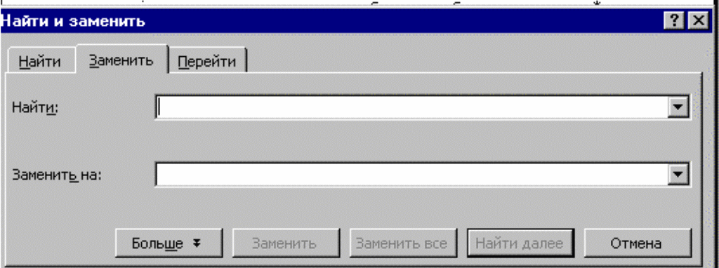 Заміна тексту здійснюється командою Правка/Заменить. Вікно діалогу Заменить подібне до вікна діалогу Найти, але має ряд додаткових елементів. У поле Заменить на вводиться текст заміни.