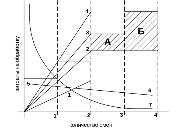 1, 2, 3, 4 — затраты на станочных линиях с универсальным оборудованием при соответствующей сменности работы ГПС;