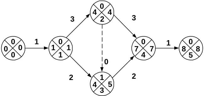 1 Расчет ранних сроков свершения событий. Для исходного события ранний срок совершения принимается равным 0, а для последующих рассчитывается путем добавления к раннему сроку предшествующего события продолжительности работы: