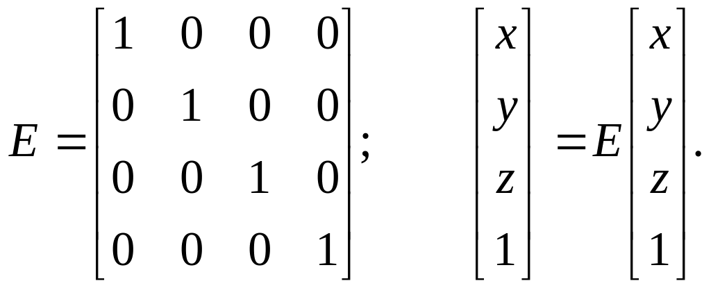 Определение. Тождественным называется преобразо-вание однородных координат точки Р(x, y, z, 1), не изме-няющее их. Матрицей данного преобразования будет еди-ничная матрица