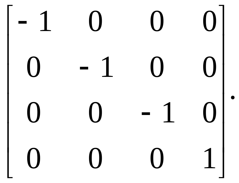 в) Отражение относительно начала координат . Все одно-родные координаты точек изменяют свой знак на противо-положный:Р=(x, y, z,1) →Р* =( -x, -y, -z,1). Матрицы пре-образования будут следующими: