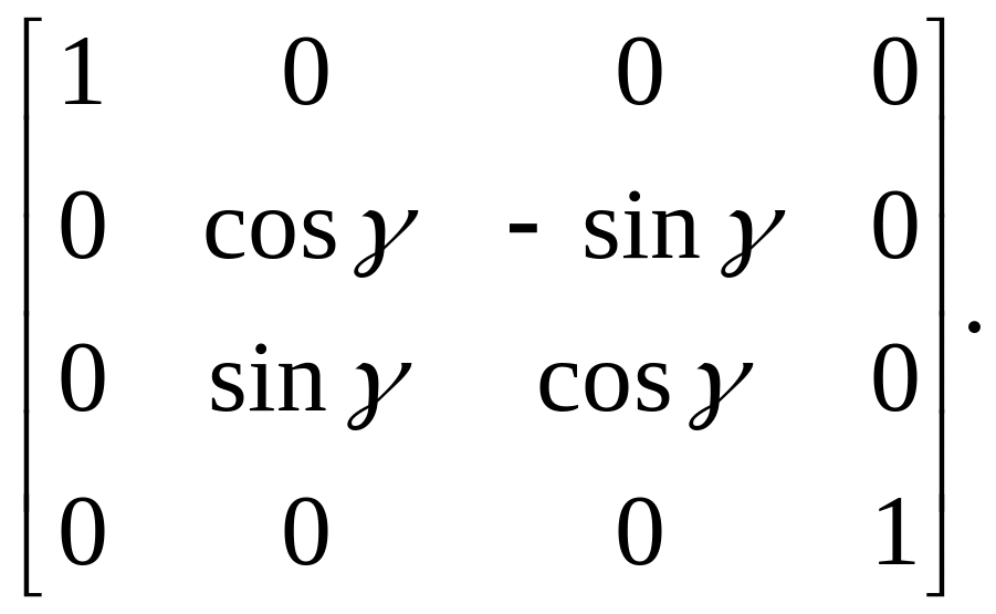Поворот вокруг произвольной оси, проходящей через начало координат, можно представить в виде последо-вательных поворотов вокруг осей x, y, z. Положительные на-правления углов поворота вокруг этих осей обычно задают таким образом, чтобы из положительного направления оси поворот происходил против часовой стрелки. Соот-ветствующие матрицы имеют следующий вид: