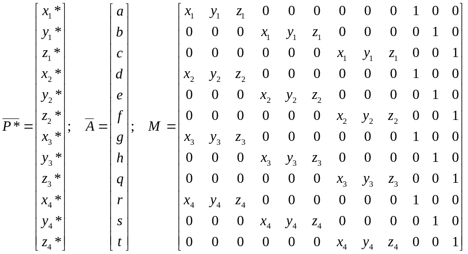При пространственном расположении точек det М≠0 и система имеет единственное решение вида: