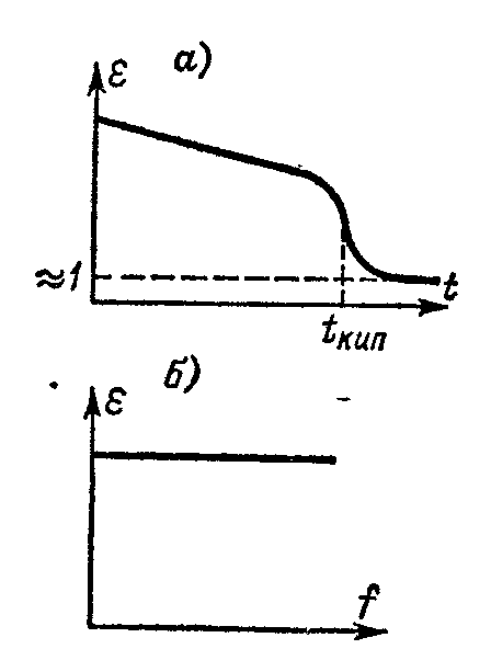Зависимость диэлектрической проницаемости неполярной жидкости от температуры связана с уменьшением числа молекул в единице объема. Значение диэлектрической проницаемости неполярных жидкостей обычно не превышает 2,5, а значение диэлектрической проницаемости полярных жидкостей 3,5-6,0. Влияние температуры и частоты на диэлектрическую проницаемость неполярной жидкости показано на рис. а, б..