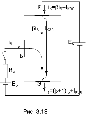 Если теперь замкнуть цепь эмиттера, то появится ток iЭ=EЭ/RЭ (задаваемый внешней цепью). Ток эмиттера будет передаваться в коллектор с коэффициентом a .