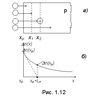 из которого следует, что диффузионная длина Ln представляет собой расстояние, на котором избыточная концентрация уменьшается в е раз. (Рис. 1.12,б).