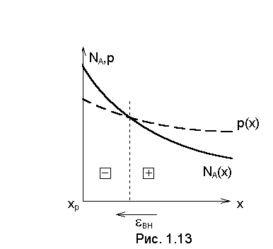 Распределение избыточной концентрации дырок вдоль оси x имеет такой же характер, как и распределение концентрации электронов, но при этом диффузии дырок не возникает, так как при смещении дырок в направлении оси x отрицательный заряд инжектированных электронов оказывается не скомпенсированным положительным зарядом неравновесных дырок, вследствие чего возникает внутреннее электрическое поле, препятствующее диффузии дырок. Формально можно считать, что диффузионное движение дырок происходит, но одновременно с этим происходит встречное движение дырок, обусловленное возникшим внутренним полем. Эти встречные потоки дырок уравновешивают друг друга, поэтому реального движения дырок не происходит. Аналогичное явление имеет место в полупроводниках с неравномерным распределением примесей. На рис. 1.13 представлен случай, когда концентрация акцепторной примеси NA(x) убывает в направлении оси x. Полагаем приблизительно, что все акцепторы ионизированы и, пренебрегая наличием в полупроводнике электронов, можно считать, что p(x)» NA(x), то есть закон распределения концентрации дырок такой же, как закон распределения акцепторов. В этих условиях неравномерное распределение концентрации дырок вдоль оси xдолжно вызвать диффузию дырок, в результате чего снизится их концентрация у поверхности и возрастет их концентрация в глубине полупроводника, следовательно, отрицательные заряды акцепторов окажутся не скомпенсированными и возникнет внутреннее электрическое поле, препятствующее диффузии дырок. Если в такой полупроводник через сечение xp инжектировать электроны, то внутреннее поле для этих электронов окажется ускоряющим. В этом случае перемещение электронов в дырочные области будет происходить как за счет диффузии, так и под действием сил внутреннего поля.