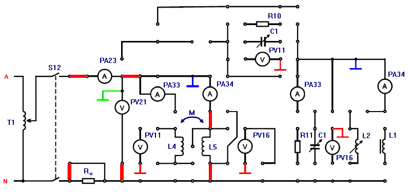 - Измерить ток I (РА23), напряжение U (PV21), мощность Р (PW) для первой катушки L4R4. Записать показания приборов в таблицу 1.2