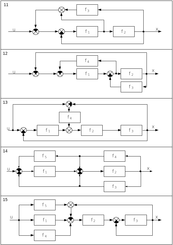 Ниже приведены варианты задач для самостоятельного решения на практических и лабораторных работах по курсу “Теория автоматического управления”. Для всех вариантов первые три звена на структурной схеме представляют собой апериодические звенья с передаточными функциями ki /(Ti p + 1) (i = 1,2,3) ; четвертое и пятое звенья усилители с коэффициентами усиления k4 , k5 . Числовые значения коэффициентов усиления и постоянных времени приведены в табл. 1. В результате выполнения задания студент должен решить следующие задачи с помощью пакета прикладных программ.