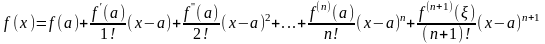 Формула Тейлора. Пусть функция f(x) имеет в точке а и некоторой ее окрестности производные порядка n+1. Пусть х-любое значение аргумента из указанной окрестности, х=а. Тогда между точками а и х найдется точка такая, что справедлива следующая формула: