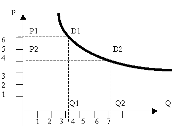 График показывает, что при цене 6 руб., объём спроса равен 3 единицам товара. Когда цена снизилась до 4 руб., объём спроса вырос до 6 единиц. Площадь прямоугольника P1D1Q1O показывает величину дохода, когда цена равна 6 руб., а площадь прямоугольника P2D2Q2O – доход, когда цена равна 4 руб. В первом случае площадь прямоугольника меньше, чем во втором.