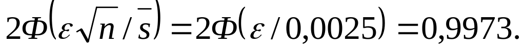 Следовательно, Ф(ε/0,0025) = 0,49865. Из табл.II Приложения найдем ε/0,0025 = 3, откуда получаем ε = 0,0025 ∙ 3 = 0,0075.