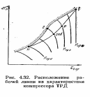 Форма расположения рабочей линии в поле характеристики компрессора зависит от расчетных параметров компрессора, типа двигателя и условия (закона) регулирования. На рис 4.32 показано типичное расположение рабочей линии на характеристике нерегулируемого компрессора (с высокой расчетной степенью повышения давления).