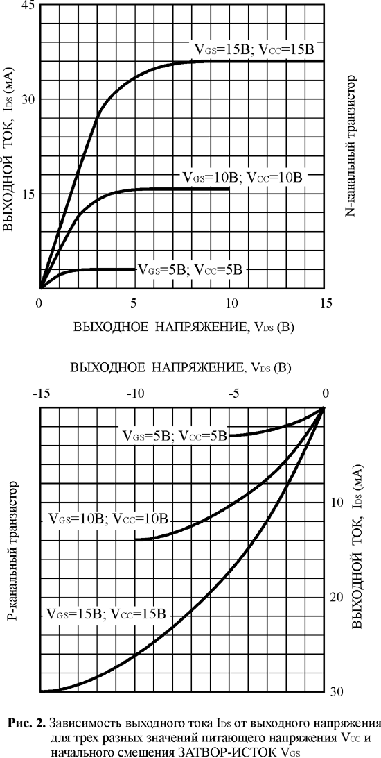 На рис. 2 показаны характерные кривые N-канального и P-канального полевых транзисторов, работающих в режиме обогащения.