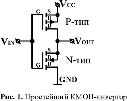 Основной КМОП-схемой является инвертор, показанный на рис. 1. Он состоит из двух полевых транзисторов, работающих в режиме обогащения: с каналом P-типа (верхний) и каналом N-типа (нижний). Для обозначения выводов питания приняты: VDD или VCC — для положительного вывода и VSS или GND — для отрицательного. Обозначения VDD и VCC позаимствованы из обычных МОП-схем и символизируют источники питания истока и стока транзисторов. Они не относятся непосредственно к схемам КМОП, поскольку выводами питания являются истоки обоих комплементарных транзисторов. Обозначения VSS или GND позаимствованы от ТТЛ-схем, и эта терминология сохранилась и для КМОП-микросхем. Далее будут указываться обозначения VCC и GND.