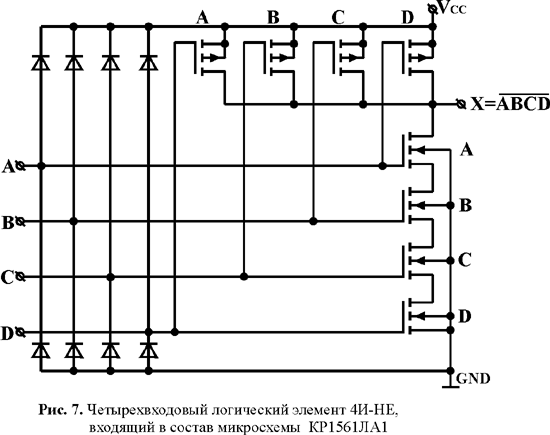 Проще говоря, неиспользуемые входы не должны быть оставлены не подключенными. По причине очень большого входного сопротивления (1012 Ом), плавающий вход может дрейфовать между логическими “нулем” и “единицей”, создавая непредсказуемое поведение выхода схемы и связанные с этим проблемы в системе. Все неиспользуемые входы должны быть подключены к шине питания, “общему” проводу или другому используемому входу. Выбор совершенно не случаен, поскольку следует учитывать возможное влияние на выходную нагрузочную способность схемы. Рассмотрим, к примеру, четырехвходовый элемент 4И-НЕ, используемый, как двухвходовый логический вентиль 2И-НЕ. Его внутренняя структура показана на рис. 7. Пусть входы A и B будут неиспользуемыми входами.