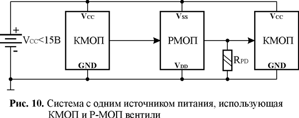Если в системе используются ТТЛШ-схемы, то должны быть, по крайней мере, два источника питания. В таком случае, КМОП-схема может работать от однополярного источника и управлять P-МОП-схемой непосредственно (рис. 12).