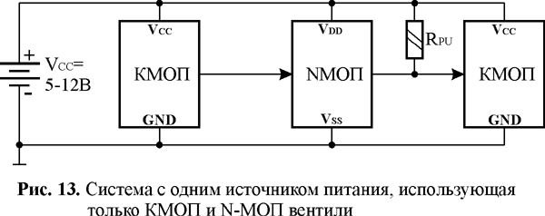 Согласование КМОП с N-МОП-схемами проще, хотя некоторые проблемы существуют. Во-первых, N-МОП-схемы требуют меньшего напряжения источника питания, обычно в диапазоне 5-12 В. Это позволяет согласовывать их с КМОП-схемами непосредственно. Во вторых, амплитуда выходного сигнала КМОП-схем находится в диапазоне практически от нуля до напряжения источника питания минус 1-2 В.При более высоких значениях напряжения источника питания N-МОП и КМОП-схемы могут работать напрямую, поскольку выходной уровень логической единицы N-МОП-схемы будет отличаться от напряжения источника питания всего на 10-20%. Однако, при меньших значениях напряжения питания, напряжение уровня логической единицы будет меньше уже на 20-40%, поэтому необходимо включение “подтягивающего” резистора (рис. 13).