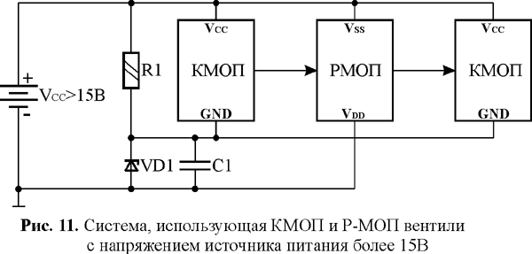 Другим способом в полностью МОП-системе является применение источника опорного напряжения на основе обычного стабилитрона для формирования более отрицательного потенциала, питающего КМОП-схему (рис. 11).
