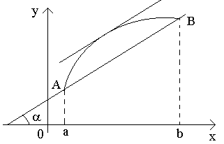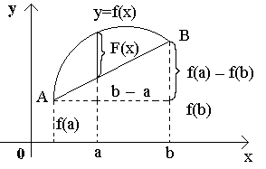 Выясним геометрический смысл введенной функции. Для этого рассмотрим график данной функции на [a; b] и напишем уравнение хорды АВ. Заметим, что угловой коэффициент хорды и она проходит через точку A(а; f(a)). Следовательно, ее уравнение y = f(a) + k(x – a). Но F(x)=f(x)–[f(a)+k(x–a)]. ПоэтомуF(x) при каждом x есть разность ординат графика y= f(x) и хорды, соответствующих точкам с одинаковой абсциссой. Легко видеть, что F(x) непрерывна на [a; b] , как разность непрерывных функций. Эта функция дифференцируема внутри [a; b] и F(a)=F(b)=0. Следовательно, к функции F(x) можно применить теорему Ролля. Согласно этой теореме найдется точка c (a; b), что F'(c)=0. Но F '(x) = f'(x) – k, а значит,F'(c) = f'(c) – k = 0. Подставляя в это равенство значение k, получим